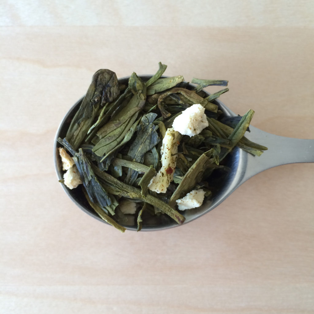 Ingredients: Organic dragon well tea, organic freeze-dried pineapple pieces, crushed aleppo pepper, organic smoked chili pepper flakes, organic natural flavors